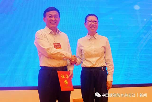 中國建筑防水協(xié)會常務駐會副會長苗燕向胡希寶頒發(fā)瓦屋面分會副秘書長證書。